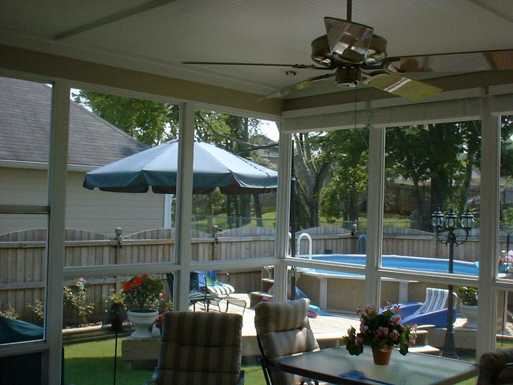 A view of the pool You can see the deck I built around the pool. It's made of several odd-shaped triangular sections.